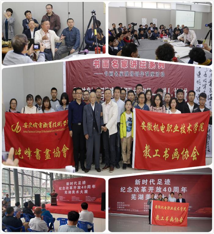 中国传统文化博大精深,中国书法绘画姿态繁荣,为深入贯彻落实“两学一做”常态化、践行民族文化自信、提高文化软实力的号召精神,着力提升学院教工书画协会会员的书画创作水平,在院工会的大力支持下,10月13日上午,协会组织部分会员赴芜湖市镜湖书画院参加“两学一做”常态化制度化主题实践书画名家讲坛系列现场创作观摩活动,本次邀请安徽省书画院院长,安徽省书协副主席刘廷龙先生,以“书法法度与书写情感表达相融方式初探”为主题开展书法专题讲座。讲座由芜湖市书画院院长吴晓明主持,学院办公室主任司福明,教工书画协会会长樊卫强,副会长陈庄瑾,秘书长张灿东,部分会员老师和学院大学生屹峰书画协会成员参加。
