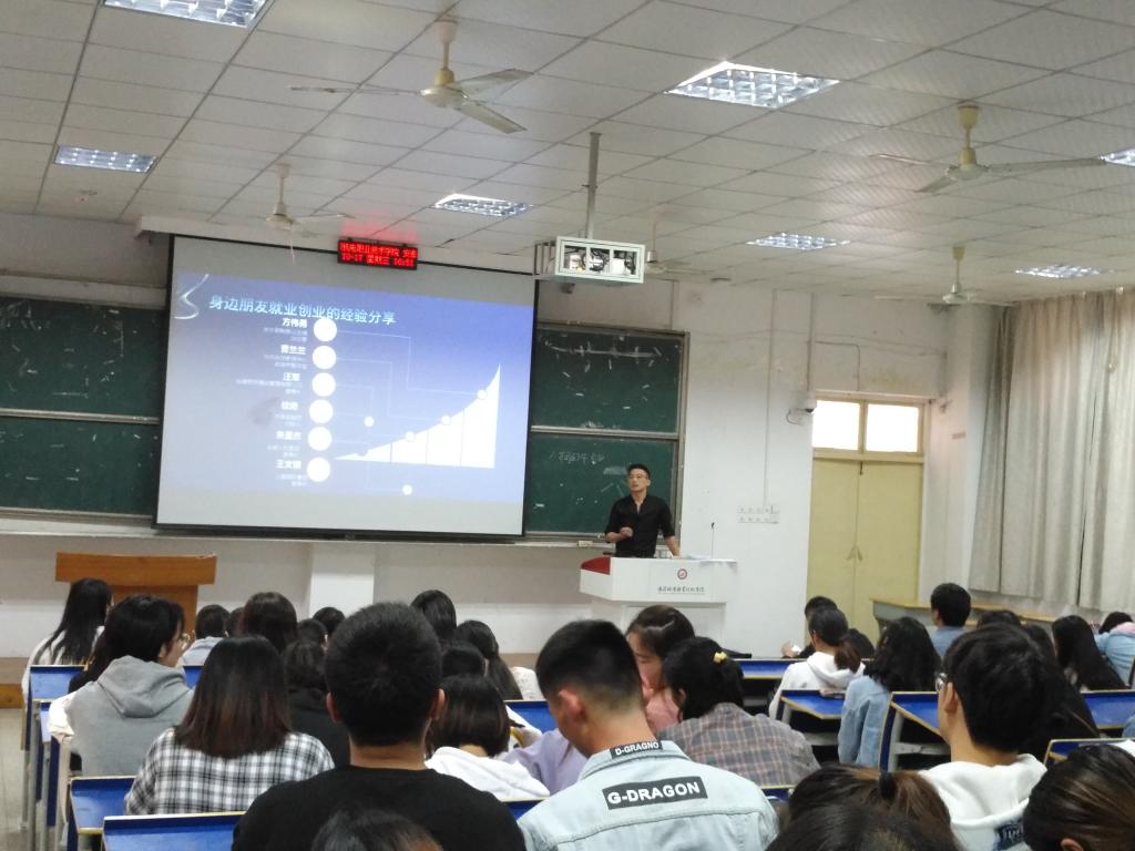 曹江首先介绍了个人就业及创业经历,接着,针对即将就业同学,曹总建议要找优秀有潜力的公司实习或就业,努力学习企业文化,学会和同事相处;而针对即将创业同学,要找对行业创业,找对创业合伙人,努力学习用人之道,努力学习企业管理经验,并随时做好失败的准备。此外,曹江还将自己身边朋友就业创业的经验进行了分享,他风趣幽默的语言不时引起在座同学的笑声,现场气氛十分活跃,而他深入浅出的讲解又让同学们在欢乐之余学到了就业和创业的宝贵经验。