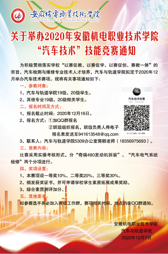 为积极贯彻落实学校“以赛促教、以赛促学、以赛促创、赛教一体”的宗旨,提升汽车检测与维修技术专业人才的培养质量,从2020年12月7日-12月28日,汽车与轨道学院成功举办2020年度“汽车技术”校级竞赛。