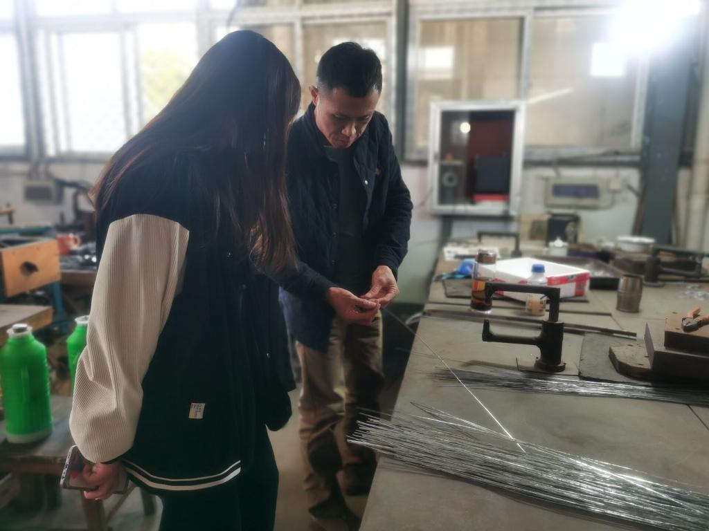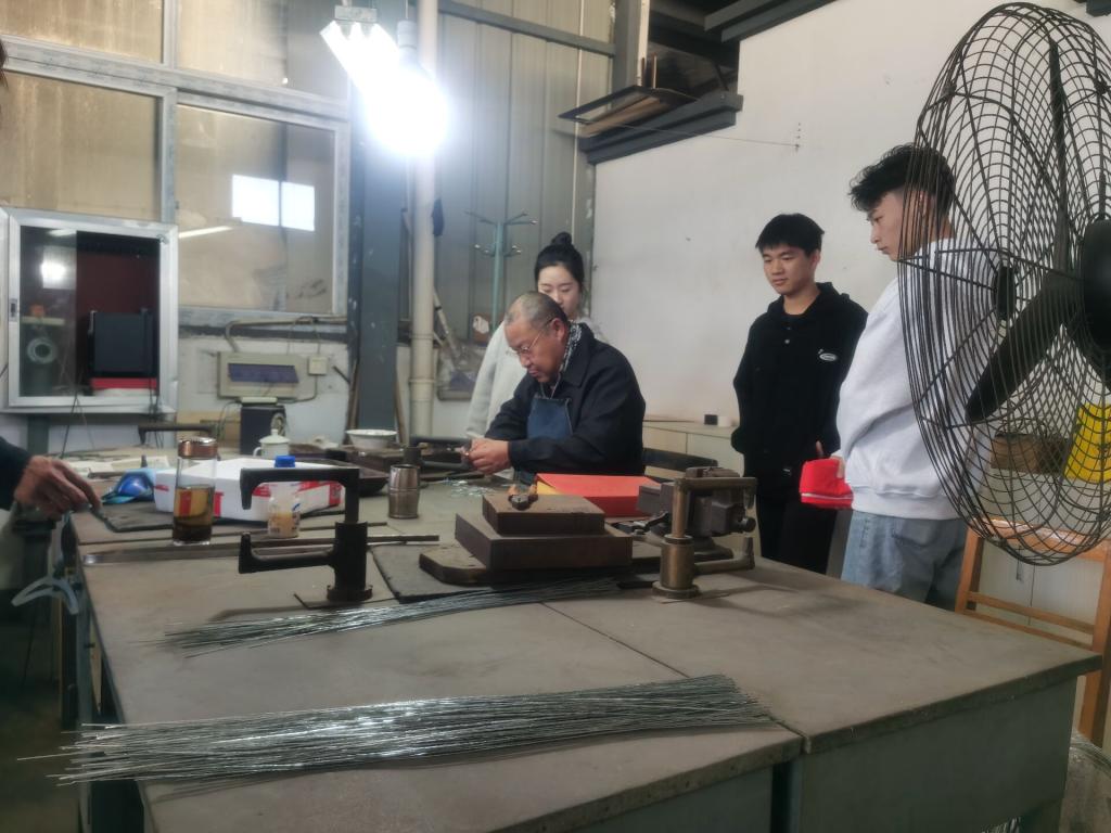 参观艺术展后,储铁艺带领同学们参观储氏铁画基地,看着基地铁画师傅制作铁画,储铁艺耐心地给同学们讲解一副铁画的诞生过程,同学们听后纷纷感叹中国文化的博大精深,感慨手工艺人的匠心独具。一根根铁丝经过千锤百炼,在铁画师傅的手里变成一幅幅精美绝伦的铁画,同学们兴致勃勃,都积极参与到选材、构思、锻打、焊接铁画的过程中来,一番体验后,同学们更加体会到铁画的精妙,深刻感受到传承非遗文化的重要性。