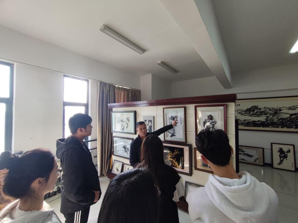 活动开始,储铁艺先带领同学们参观铁画艺术展。他结合基地展览室里陈列的从清末至今不同时期铁画大师们的近百件精品佳作讲解铁画历史,针对每一幅作品,从线条、质感、特点、构图、韵味、意境分析,通过古今对比,工艺对比,综合鉴赏优质铁画。同学们被眼前的一幅幅作品吸引,对铁画工艺产生了浓厚的兴趣,不时提出相关细节和制作工艺层面的问题,储铁艺都与耐心解答。