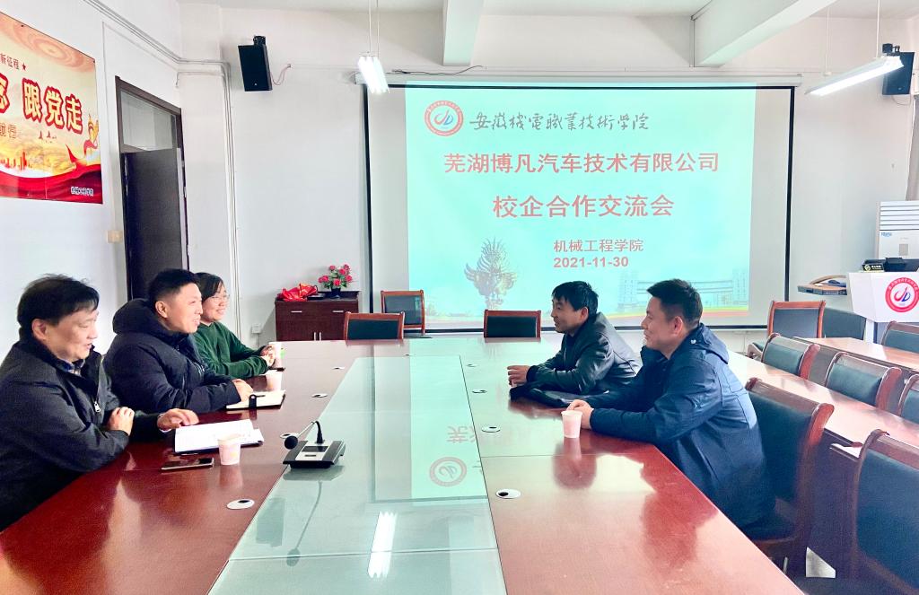 校企合作是培养符合企业需要的技能人才,毕业生实现高质量就业的重要举措。11月30日上午,机械工程学院与芜湖博凡汽车技术有限公司开展校企合作交流会。芜湖博凡汽车技术有限公司总经理王书、经理杨在,机械工程学院院长徐亮、机制教研室主任李钦生、制图教研室主任崔强以及专业教师代表参加了此次会议。