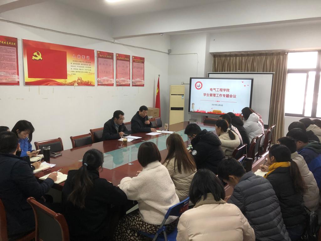 为筑牢安全防线,确保学生在校期间健康快乐成长成才,电气工程学院于12月3日下午召开学生管理工作专题会议,会议由党总支书记余丙荣主持,党总支副书记王先和全体专兼职辅导员以及协会指导老师参会。