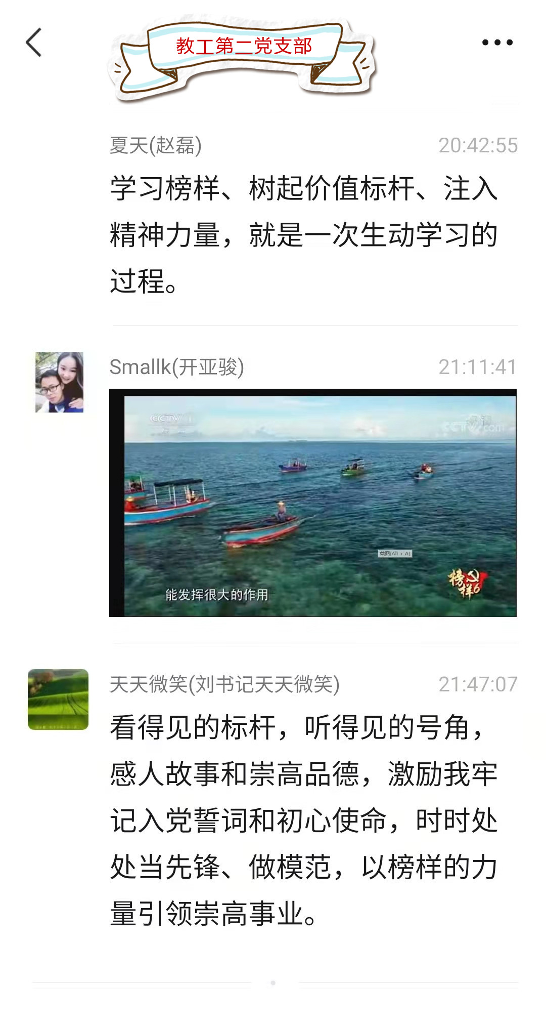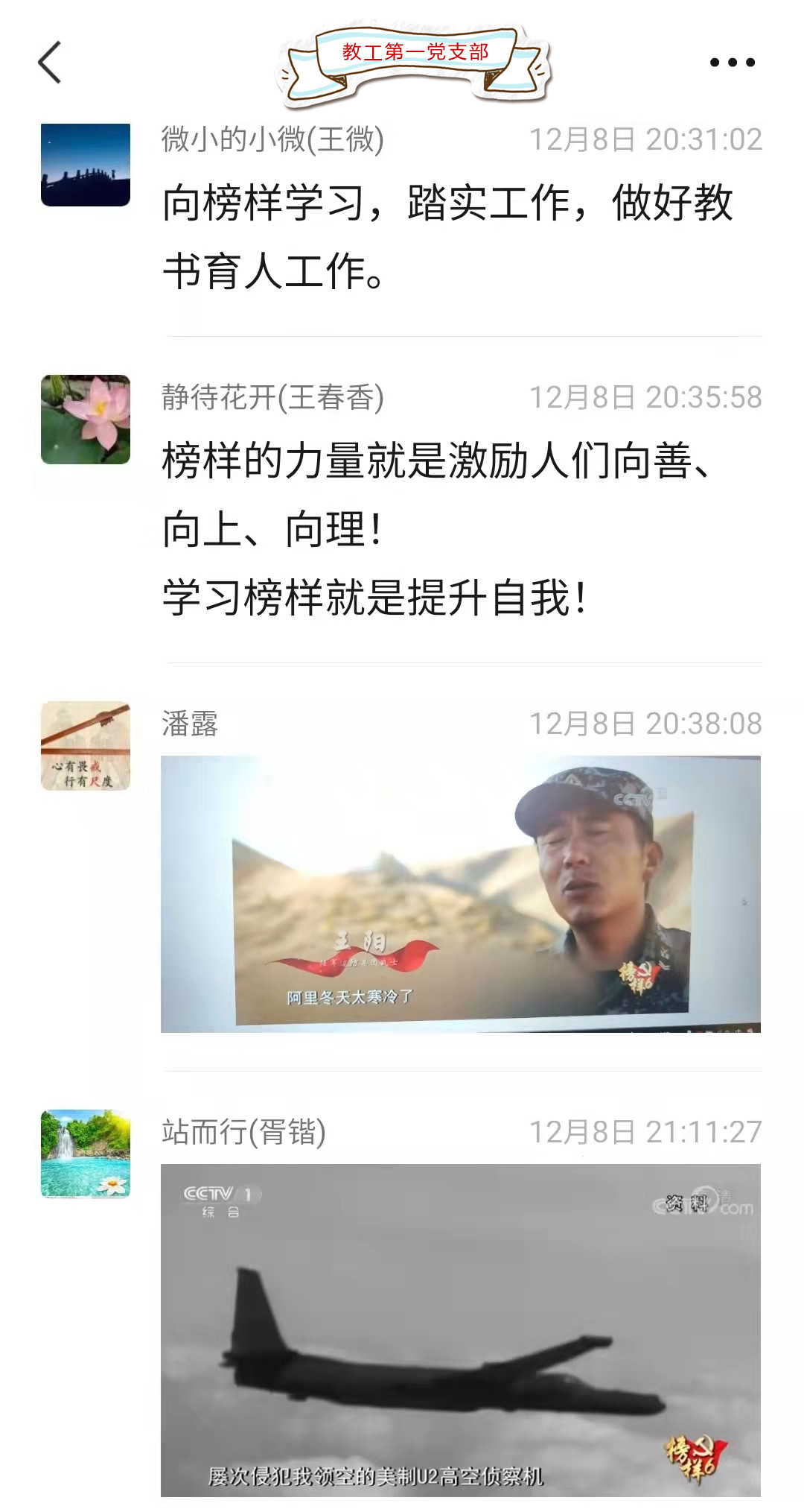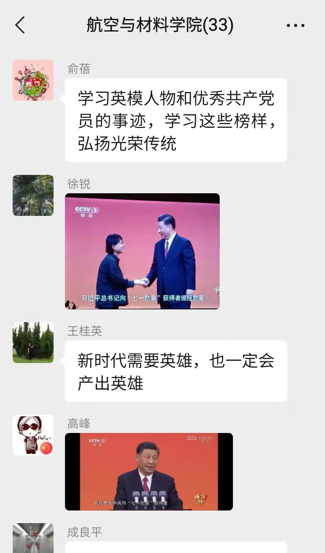 根据学校通知要求,12月8日晚8时,航空与材料学院党总支组织全体党员师生收看中央电视台综合频道(CCTV-1)建党100周年特别节目《榜样6》直播,学校党委副书记刘艺以普通党员身份参加教工第二党支部线上讨论交流,部分非党员师生积极参与学院线上讨论活动。