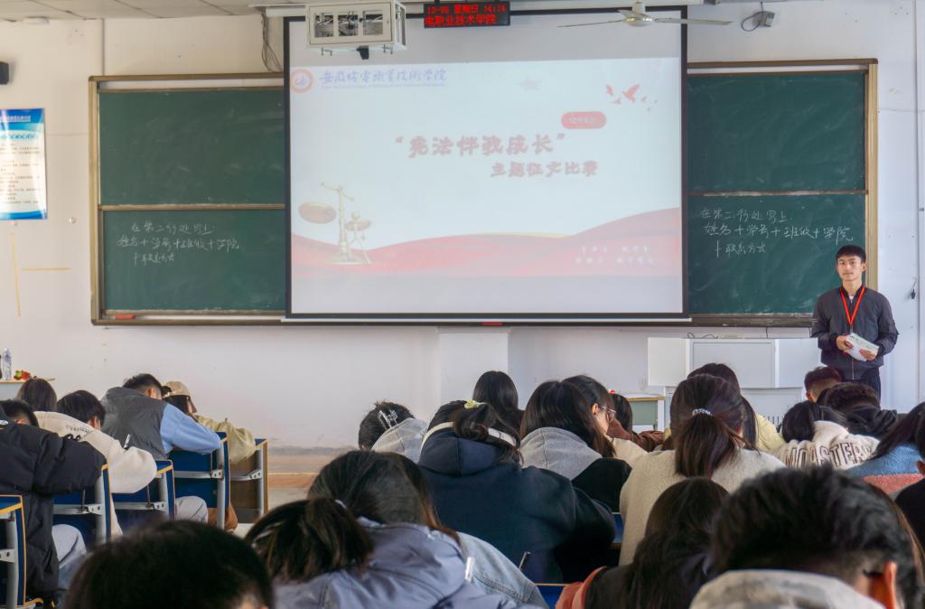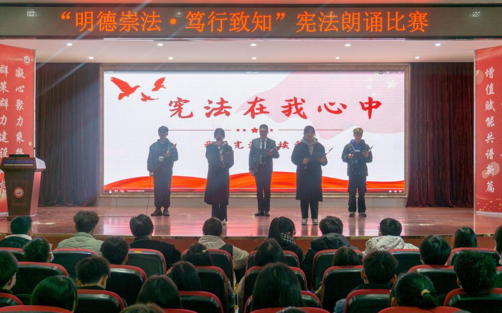 为进一步普及宪法知识,帮助大学生了解国家设立宪法日的重要意义,激发学生学习宪法的兴趣,12月4日,在第八个“国家宪法日”到来之际,校学生会举办了“明德崇法,笃行致知”主题朗诵比赛。比赛现场,来自八个学院的代表队伍共30名选手围绕宪法与国家、宪法与社会、宪法与个人等主题,与自身经历和时政热点相结合,以饱满的热情、深情的朗诵讲述宪法故事,谈论宪法感悟,讴歌宪法精神。现场同学们齐唱宪法主题歌曲《宪法伴我们成长》,从优美的歌声中体会宪法温度、感受宪法力量,让宪法光芒洒满校园,使宪法精神根植于大学生的心中。