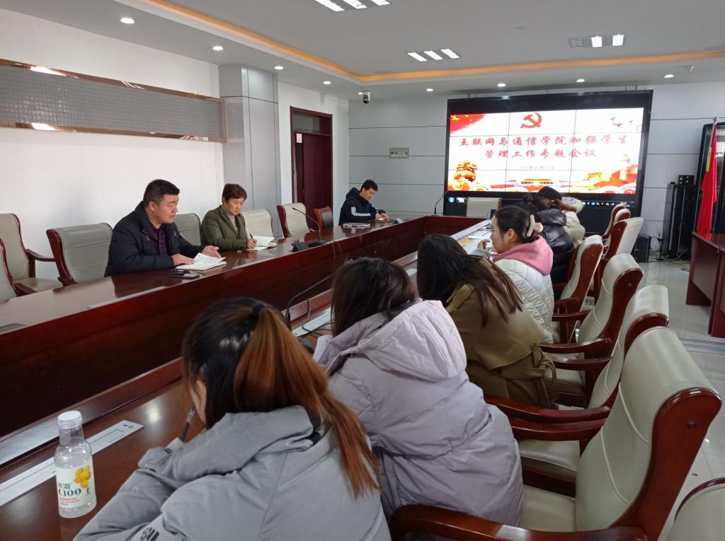 为了进一步做好我院学生管理工作,落实立德树人的根本任务,推进“三全育人”工作的落实落细,切实保障学院的安全稳定工作。12月21日下午,互联网与通信学院召开加强学生管理安全工作专题会议。互联网与通信学院党总支书记崔燕、党总支副书记张灿东以及学院全体专职辅导员参加了本次会议,会议由张灿东主持。