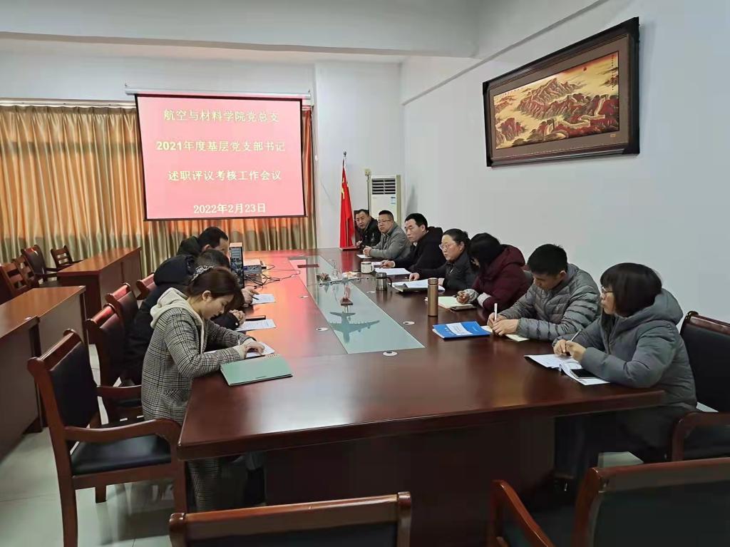 为深入贯彻落实习近平新时代中国特色社会主义思想和党的十九届六中全会精神,根据学校《2021年度党组织书记抓基层党建述职评议考核工作提示》要求,航空与材料学院党总支于2022年2月23日下午在学院党员活动室召开2021年度党支部书记述职评议考核工作会议。学院党总支支委、各党支部支委、科级以上干部参加会议,会议由党总支副书记高立主持。